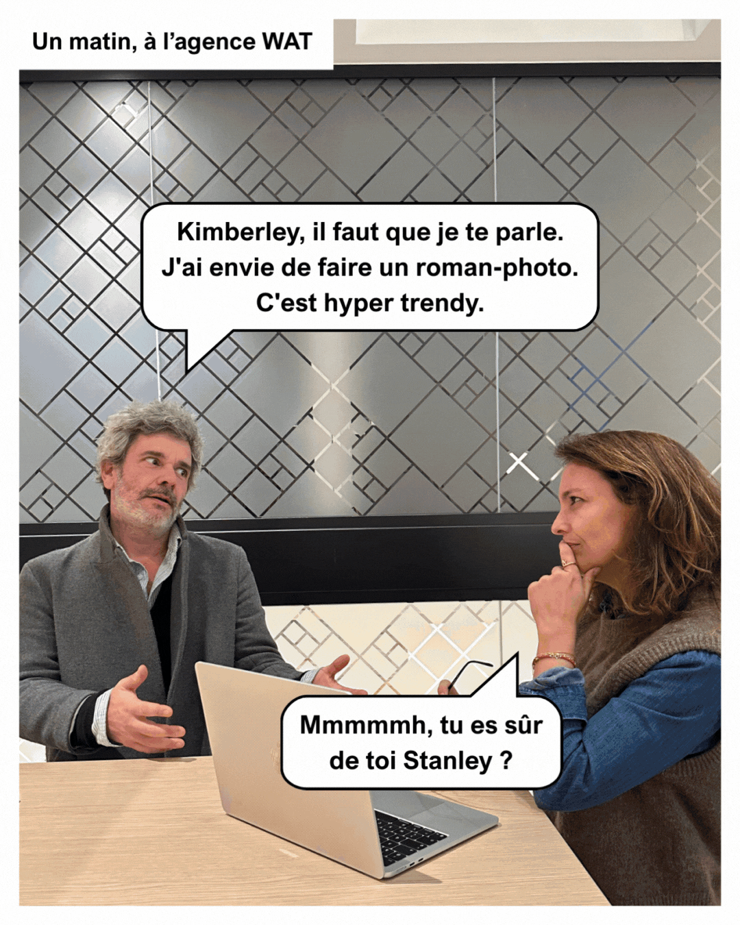 Stanley a peut-être raison. Je prends une photo, j’incruste un texte pour expliquer ou juste pour faire rire et hop, je la mets en ligne sur mon réseau social préféré et ma vie traverse l’écran ! Un vrai roman-photo ma vie… D’ailleurs, le roman-photo parlons-en, car il revient en force ! Oui, je vous assure. Alors je sais, son apparition date de 1950 dans le magazine Nous deux. Pas tout jeune comme format, ni comme référence, et les mauvaises langues diraient de lui qu’il est ringard. Sauf que. Sauf qu’il fait son grand come-back figurez-vous, et pas qu’un peu s’il vous plaît. Il a sa propre collection au Seuil, Nora Hamzawi lui fait décortiquer la vie à deux et les marques elles aussi s’en emparent sur LinkedIn (Axa, pour ne citer qu’eux). Alors bon, moi je me dis que ce serait dommage de passer à côté d’une si belle histoire, et que peut-être on pourrait essayer d’en faire un ensemble, non ?