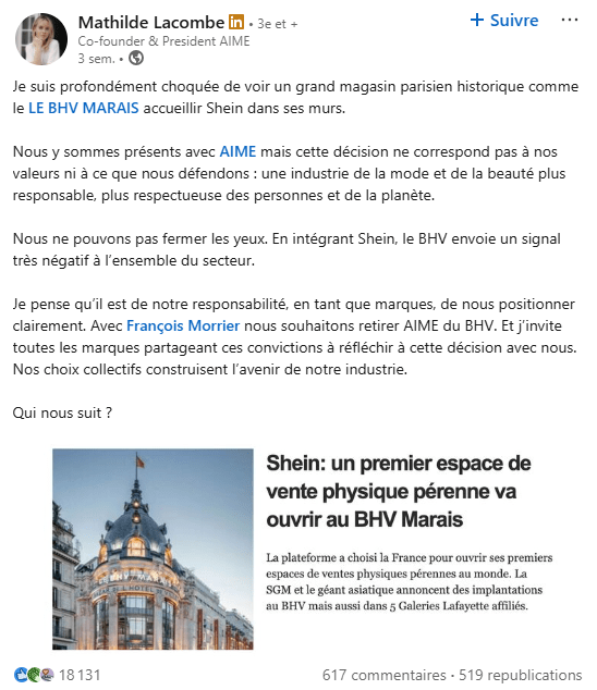 Et le mois dernier, l’arrivée de SHEIN au BHV, en plein cœur de Paris, a relancé le débat. Et c’est encore sur LinkedIn que les marques ont choisi de faire connaître leur décision de quitter le grand magasin historique.