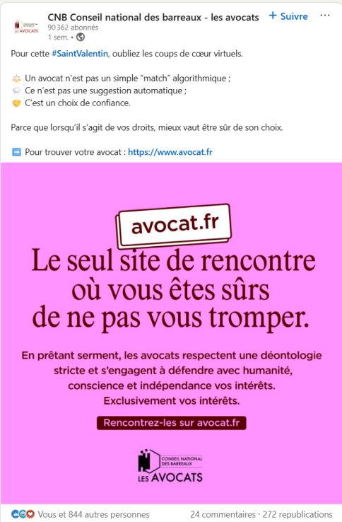 Deux jours avant la Saint-Valentin, nous avons lancé avec le Conseil National des Barreaux une campagne digitale qui détourne les codes des sites de rencontre pour rappeler une vérité essentielle : en matière de droit, toutes les rencontres ne se valent pas. A l’heure où l’on cherche des réponses juridiques comme l’on ferait son marché sur une appli de rencontre, le public confond souvent accès à l’information et véritable conseil. La campagne joue ce décalage avec humour en présentant avocats.fr comme« le seul site de rencontre où vous êtes sûr de ne pas vous tromper ».