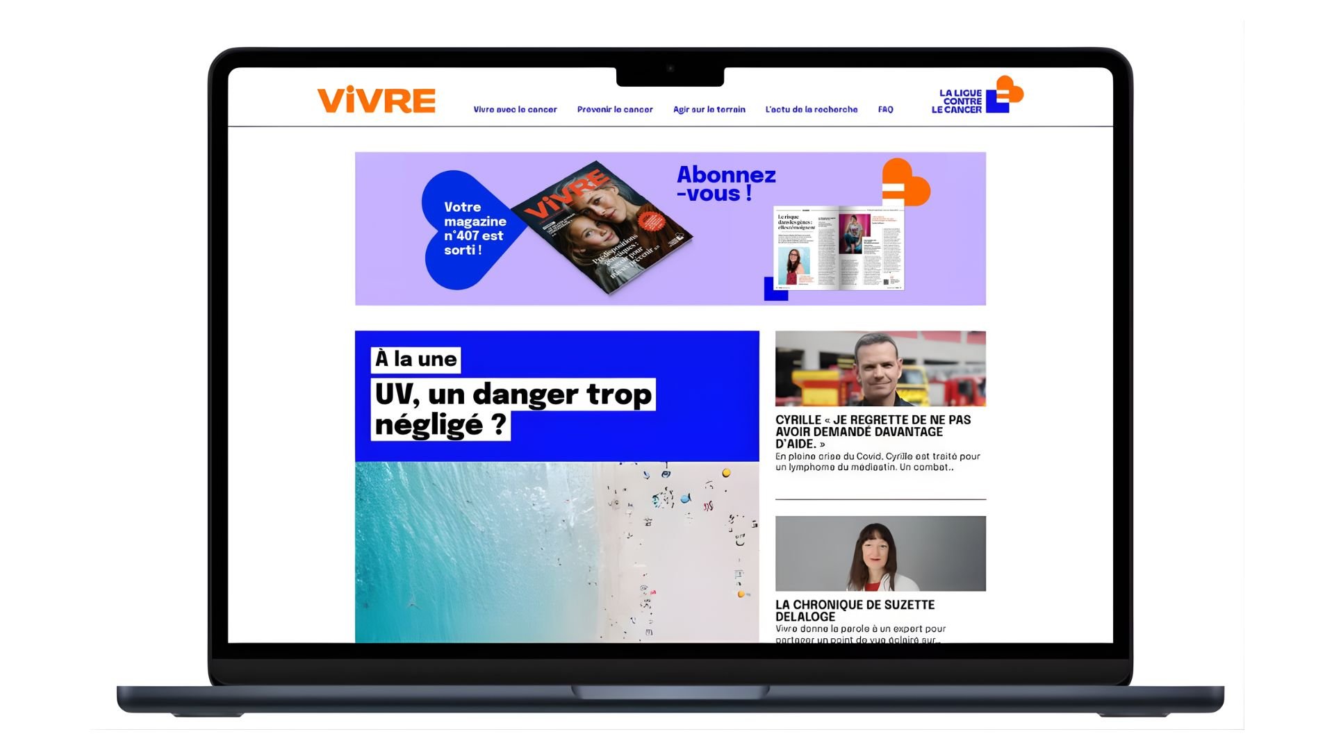VIVRE a désormais sa plateforme digitale, pensée comme un véritable site média. L’architecture a été revue pour favoriser la consultation mobile, la lecture rapide et le référencement naturel. Les contenus sont optimisés pour le web (titres, intertitres, rubriquage) et l’animation éditoriale suit le rythme des campagnes nationales comme Octobre Rose ou Mars Bleu. Résultat : une prise de parole plus régulière, plus visible, et mieux adaptée aux usages numériques.