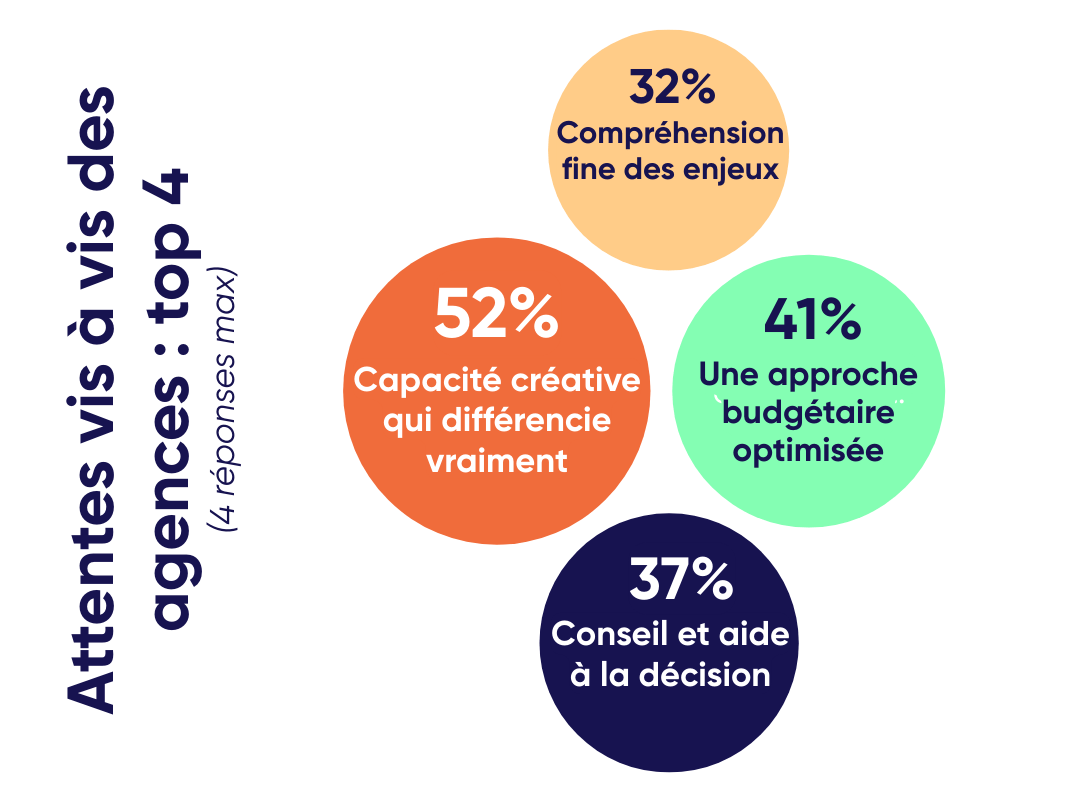 En 2026, la créativité est identifiée comme levier de différenciation et première attente vis à vis des agences (52% des réponses). Mais une créativité qui ne s’affranchit pas du réel : en 2026, la communication devra être mémorable mais aussi défendable budgétairement (41%) et mesurable dans ses effets.