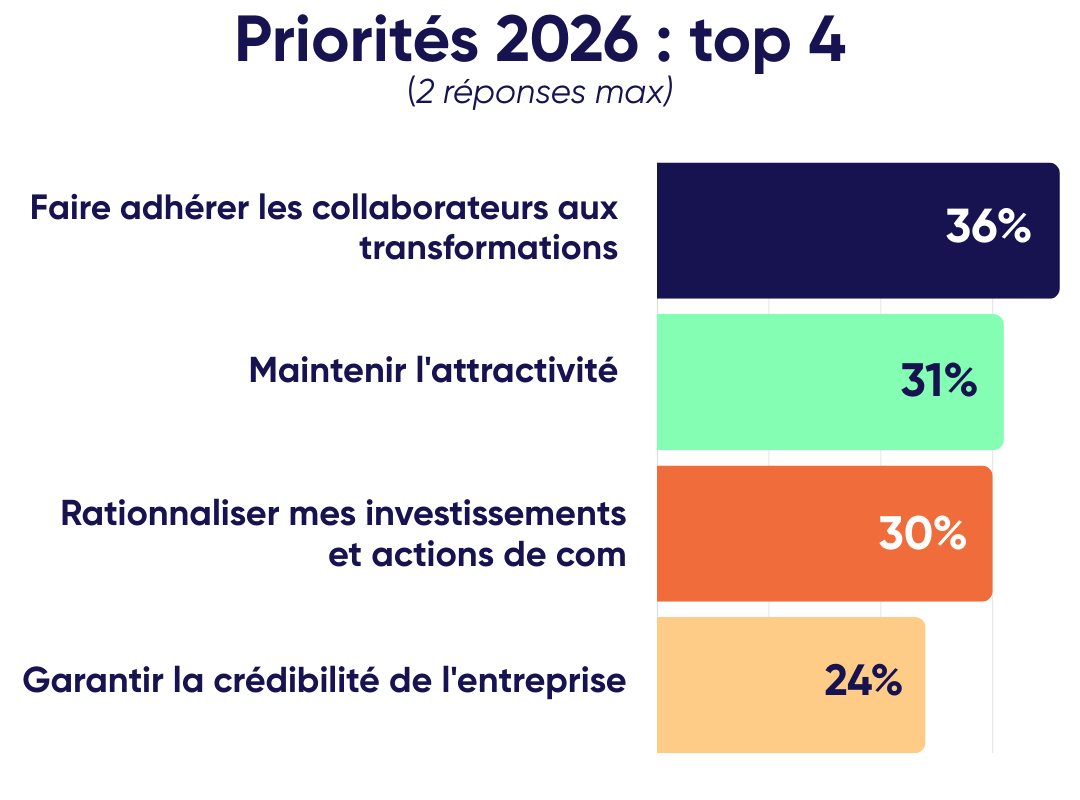 Et ce que nous révèle ce baromètre, c’est que 2026 va être une année d’arbitrages. Il s’agira en effet pour nombre d’entre vous de faire face à plusieurs priorités, comme mieux embarquer au sein de l’entreprise ou rester attractif, tout en rationnalisant les investissements et les actions de communication.