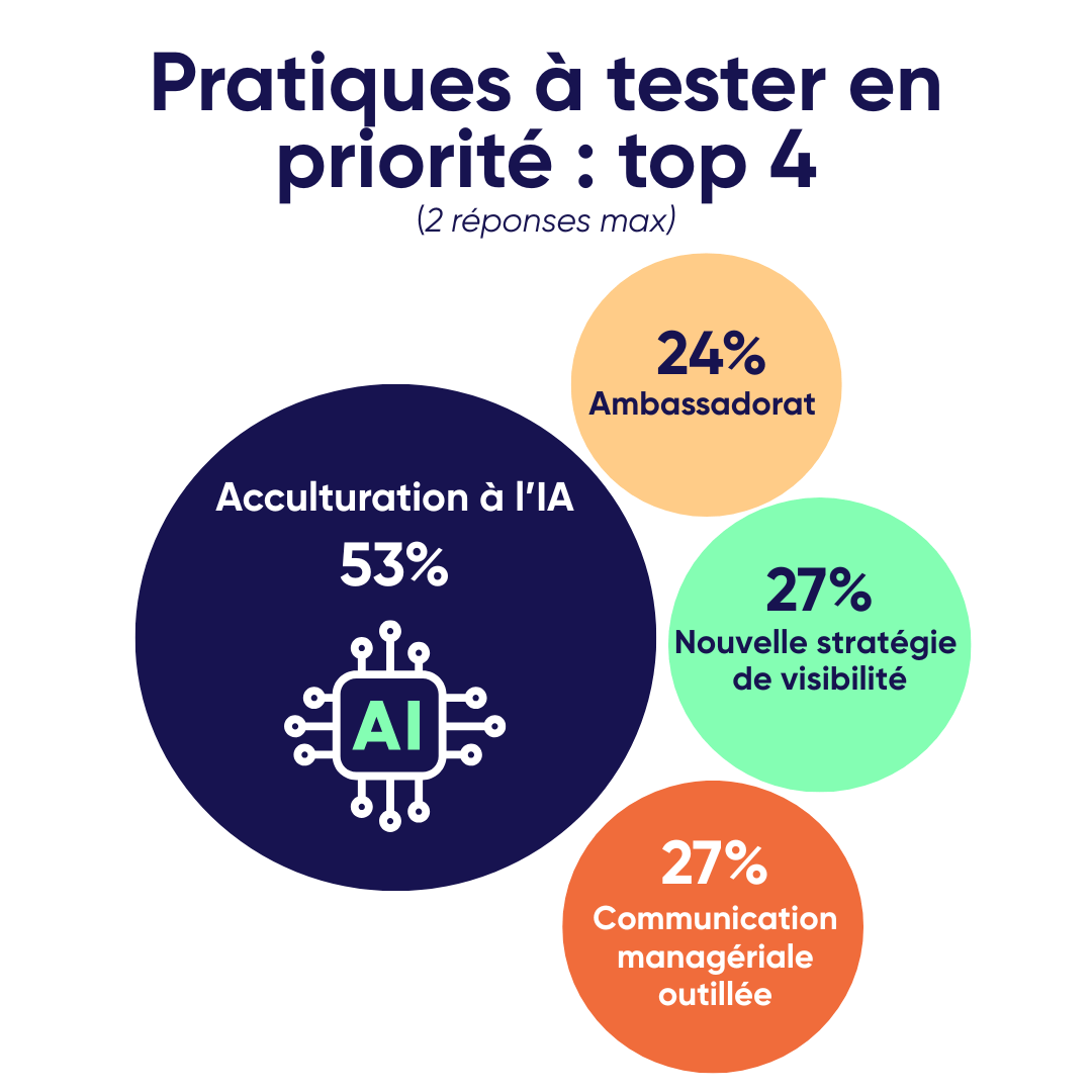 Mais l’IA sans l’humain ne serait rien. Les messages sans relai non plus. Plus les organisations s’équipent en technologie, plus elles investissent dans ce qui fait réellement circuler la parole : les managers, les collaborateurs. Communication managériale, leader advocacy et ambassadorat sont plus que jamais des pratiques à structurer ou accélérer en 2026 selon nos répondants.