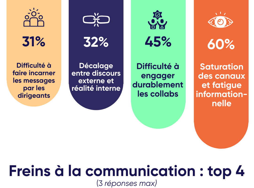 Car dans un climat politique et économique incertain, l’heure est souvent à l’économie. Financière certes, mais aussi de l’attention (ici au sens premier du terme, celle qu’on ne cherche plus tant à capter qu’à économiser : le fameux « moins mais mieux »). Alors que la saturation des canaux et la fatigue informationnelle apparaissent comme 1er frein à l’impact de la communication (60% des réponses), rationnaliser ses prises de parole ne semble plus relever du choix, mais de la nécessité. Certains répondants nous disent constater des baisses de performance dues à une “multitude de sujets dans une journée et à la sur-sollicitation”.